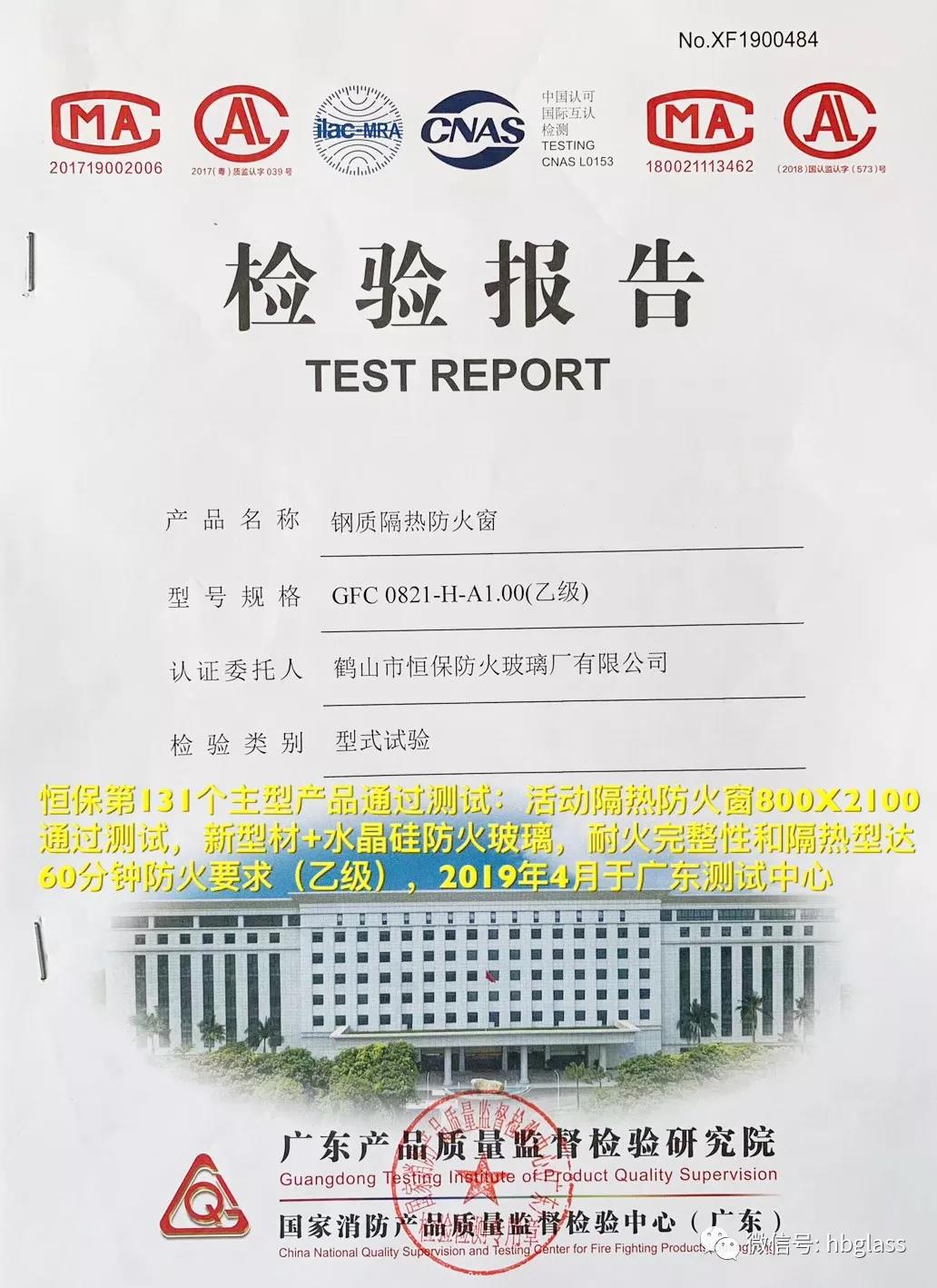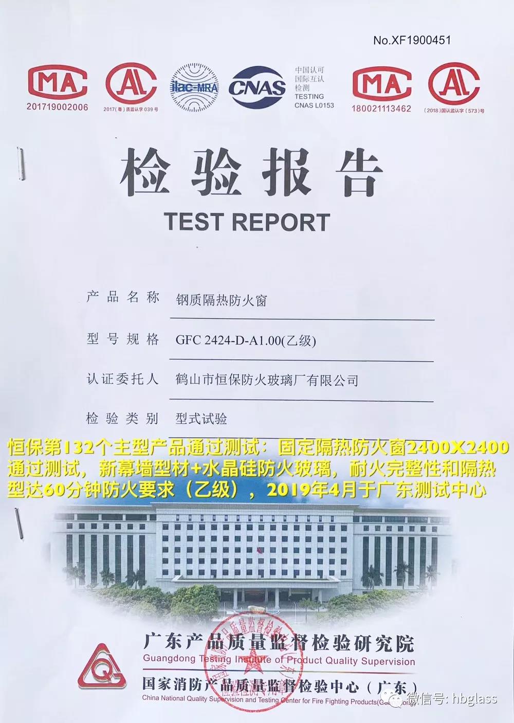 恒保第132個(gè)主型產(chǎn)品通過測(cè)試:2019年4月于廣東測(cè)試中心,恒保公司送檢的固定隔熱防火窗(2400X2400,新幕墻型材+福普思水晶硅防火玻璃),通過耐火完整性和隔熱型達(dá)60分鐘防火要求(乙級(jí))測(cè)試要求,并獲得檢測(cè)合格報(bào)告。國家強(qiáng)制性CCC認(rèn)證證書正在申請(qǐng)中。