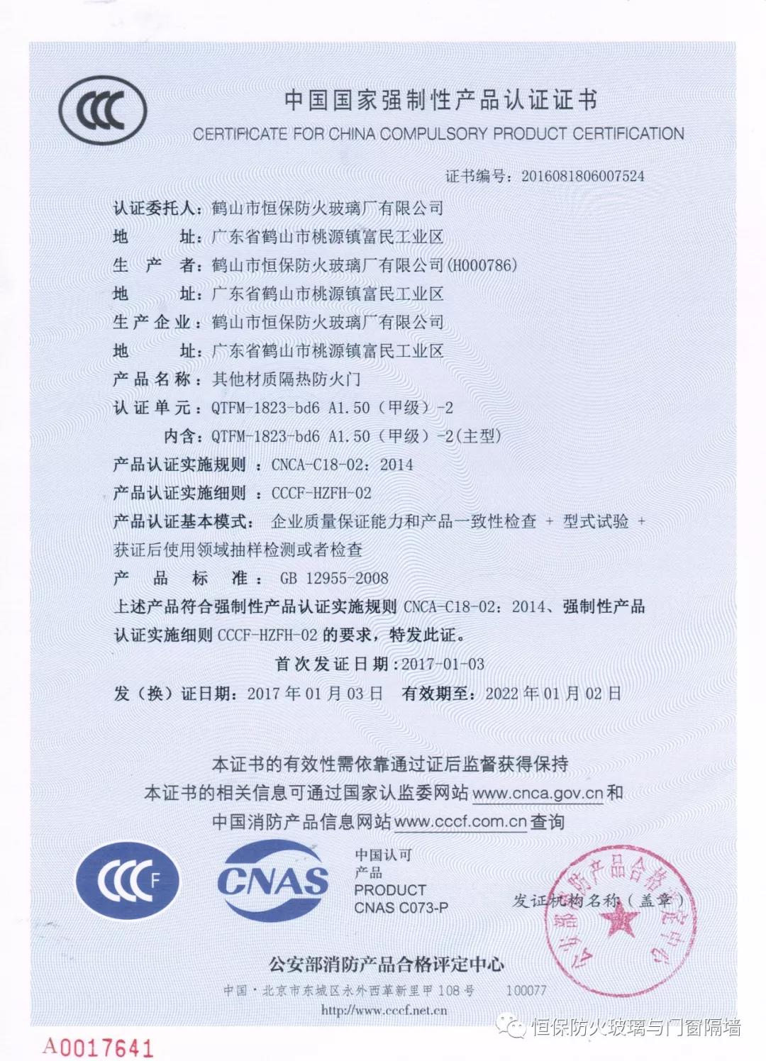 5、恒保公司一共6個產品獲得國家3C認證證書,其中大版面玻璃防火門2100mmX3000mm;