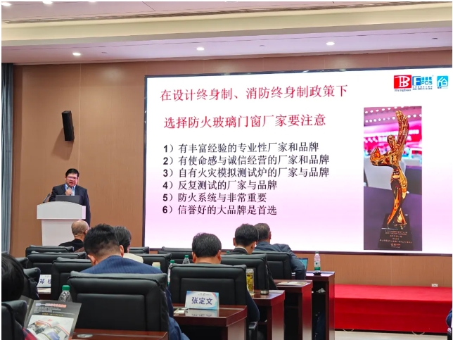 恒保董事長陳沃林先生在論壇上分享報告《高品質(zhì)防火玻璃及其在超高層建筑核心筒中的應(yīng)用》,從正確認(rèn)識防火玻璃、什么是高品質(zhì)防火玻璃、高層建筑消防當(dāng)前趨勢以及高品質(zhì)防火玻璃系統(tǒng)在高層建筑中的應(yīng)用四個方面介紹防火玻璃系統(tǒng)產(chǎn)品在高層建筑消防的作用,并分享如何正確選擇防火玻璃系統(tǒng)產(chǎn)品的經(jīng)驗(yàn),讓高層建筑更加美觀實(shí)用的同時,避免出現(xiàn)火災(zāi)時“防火玻璃”不防火的現(xiàn)象。陳沃林先生呼吁大家共同抵制假冒偽劣防火玻璃產(chǎn)品,對建筑消防安全負(fù)責(zé)、對生命安全負(fù)責(zé)。